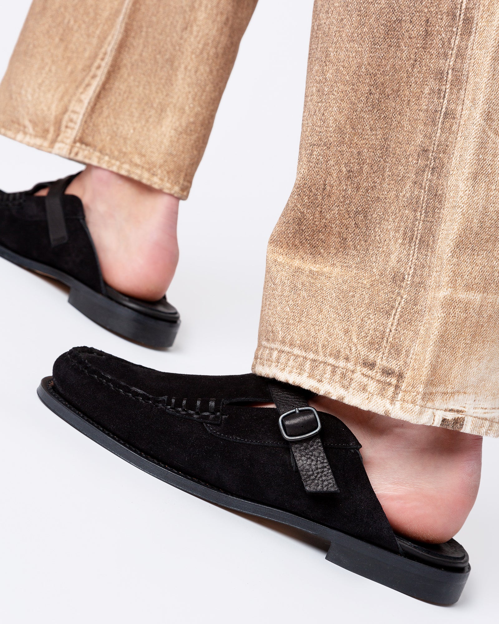 Buckle-strap mule loafer crafted in unlined full-grain double face Italian suede. Hand-sewn using the traditional moccasin construction. The outsole is stitched to the upper for extra flexibility and durability.