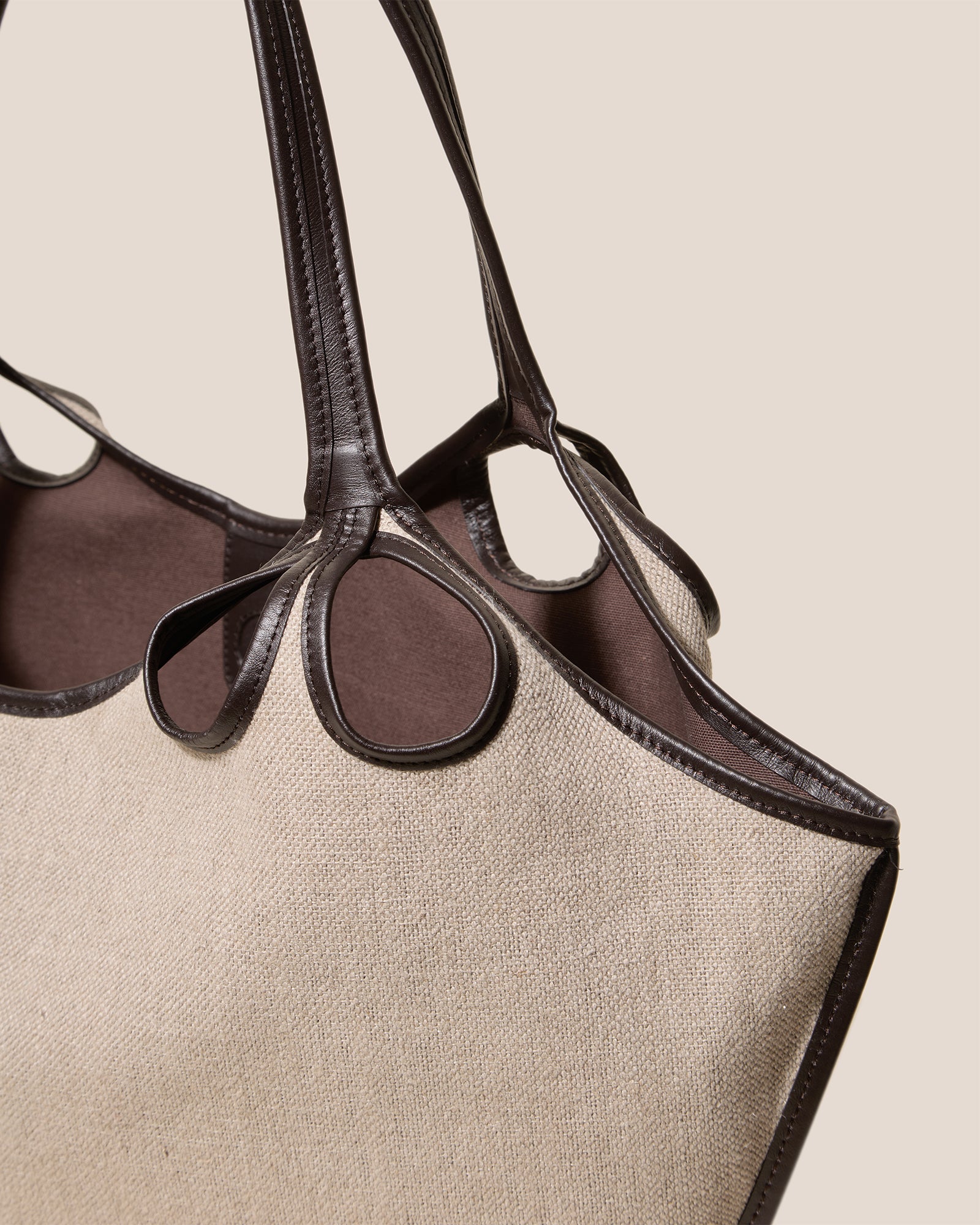 Tote bag with cut-out handles, crafted from recycled linen and trimmed with smooth calf leather.