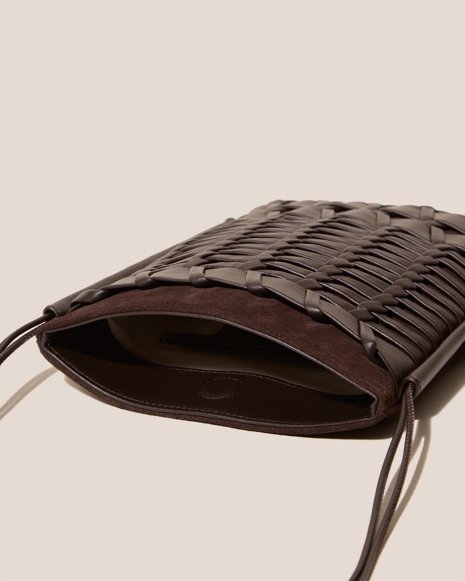 Flat square crossbody bag crafted from calf suede and smooth calf leather, with a handwoven front pocket.