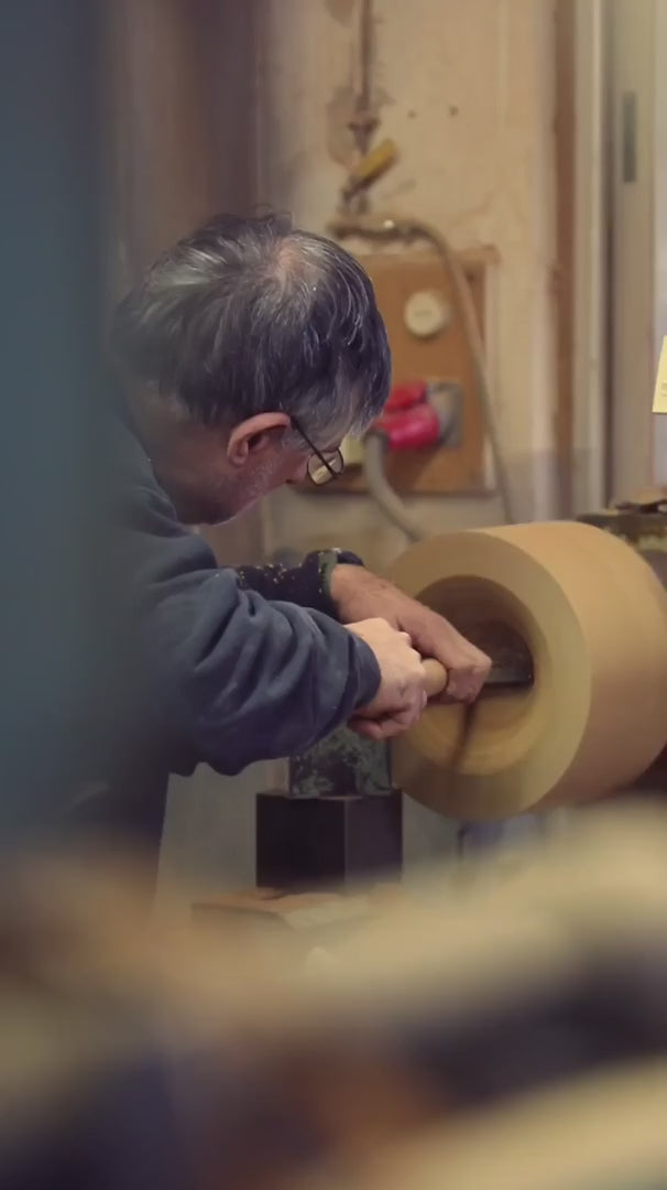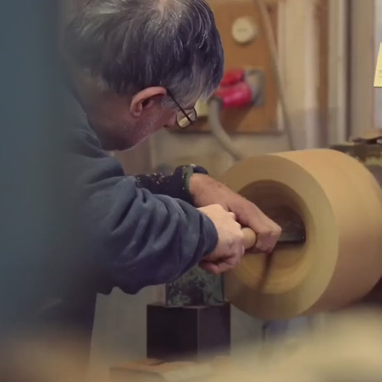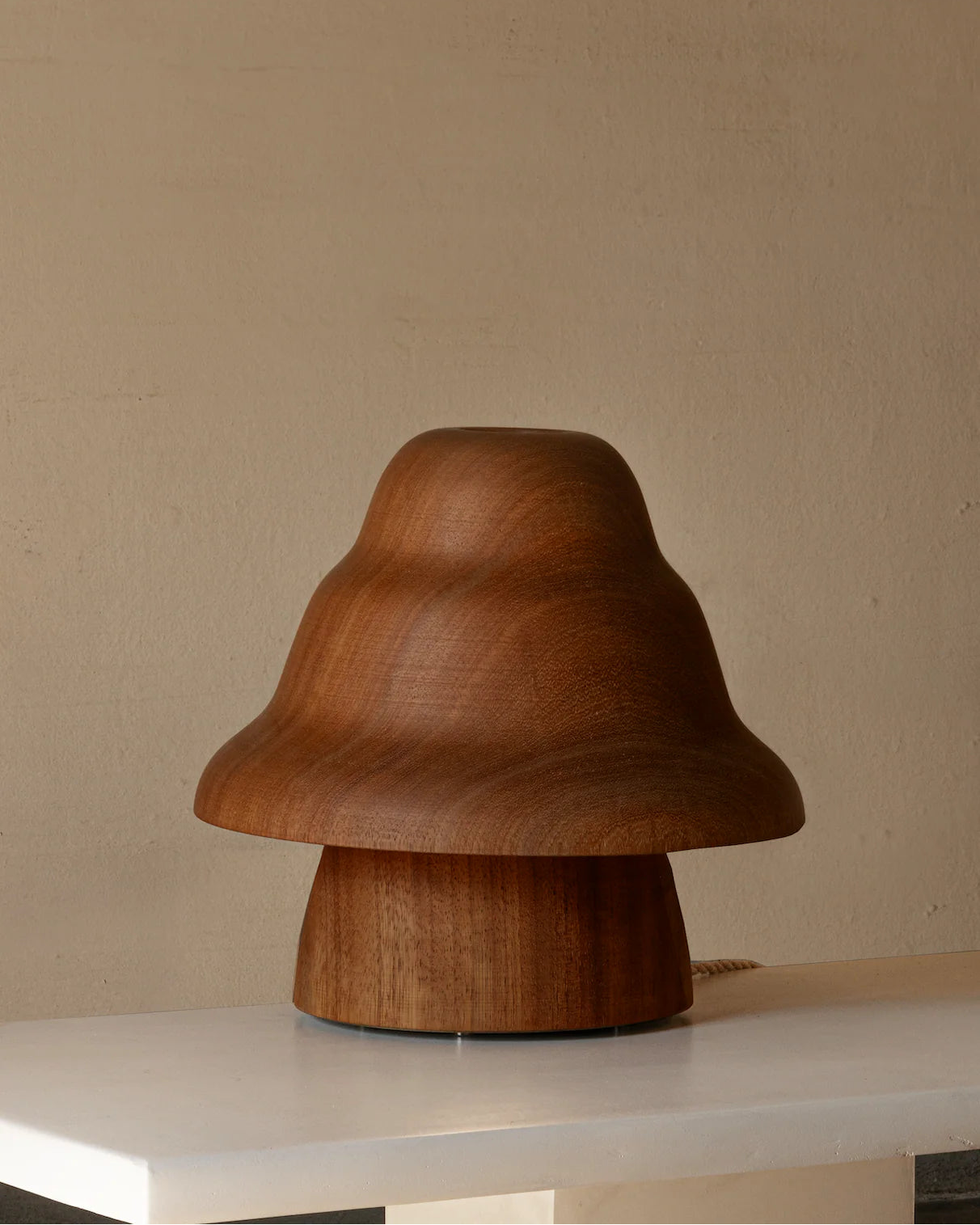 The Wobble lamp is a reinterpretation of Kilzi’s earlier "Hat" design, now defined by its gently tiered profile that mimics the motion of turned wood. Its sculptural silhouette captures the continuous rise and fall shaped by the craftsman's hands as the material spins into form.