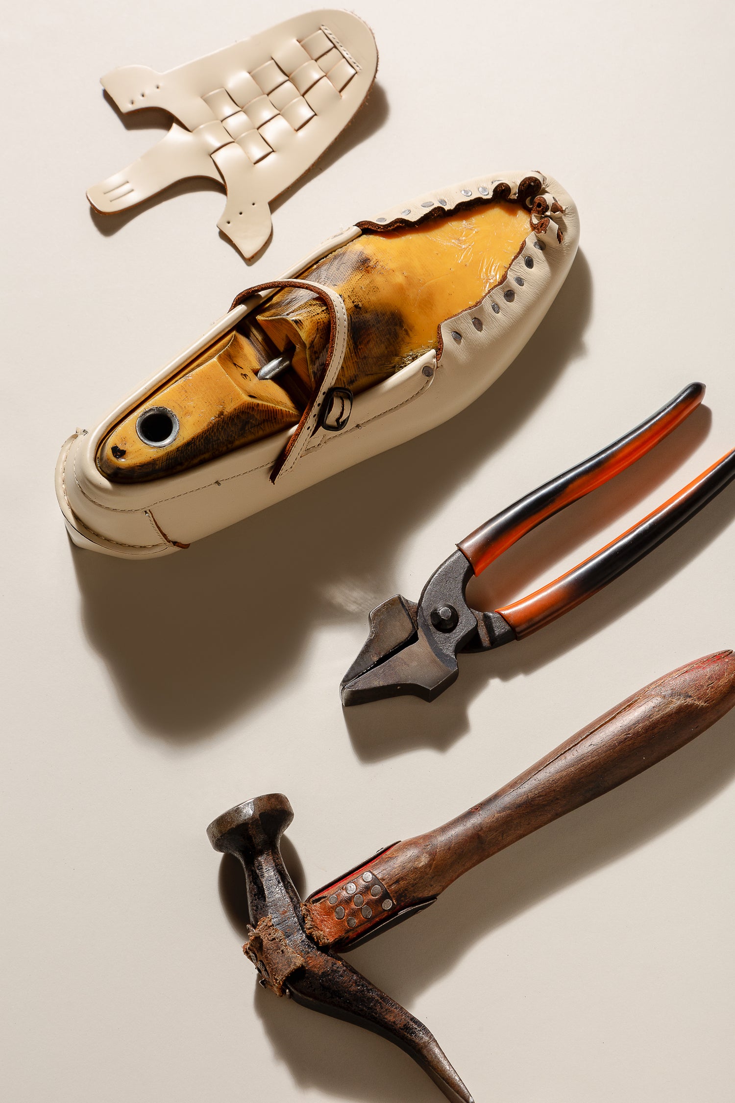 These artisans specialise in a double-needle hand stitching technique known as kiowa. When binding the moccasin's leather upper section to the sole with a strong waxed cotton thread, combined with the strength of the leather itself, kiowa stitching creates a reliable moccasin base allowing HEREU to conceive new variations on classic styles.