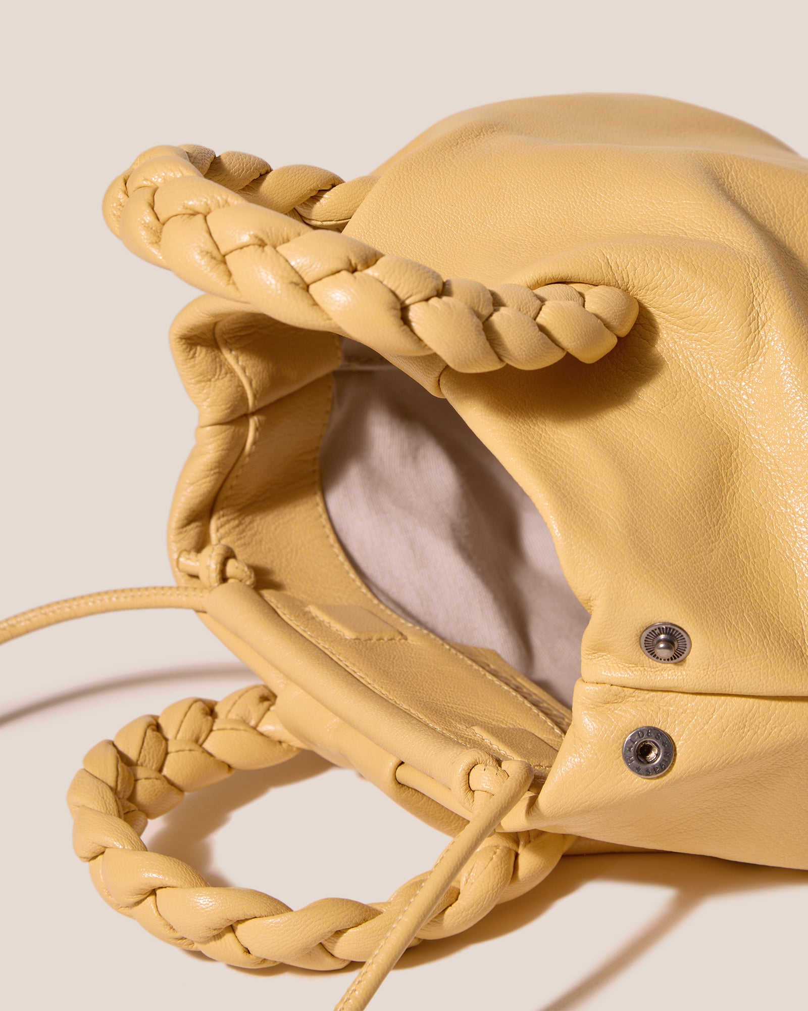 Medium leather handbag with braided leather handles. With a slim adjustable strap, it can be carried as a crossbody or by hand. Crafted in supple shiny lambskin lined with organic cotton canvas.