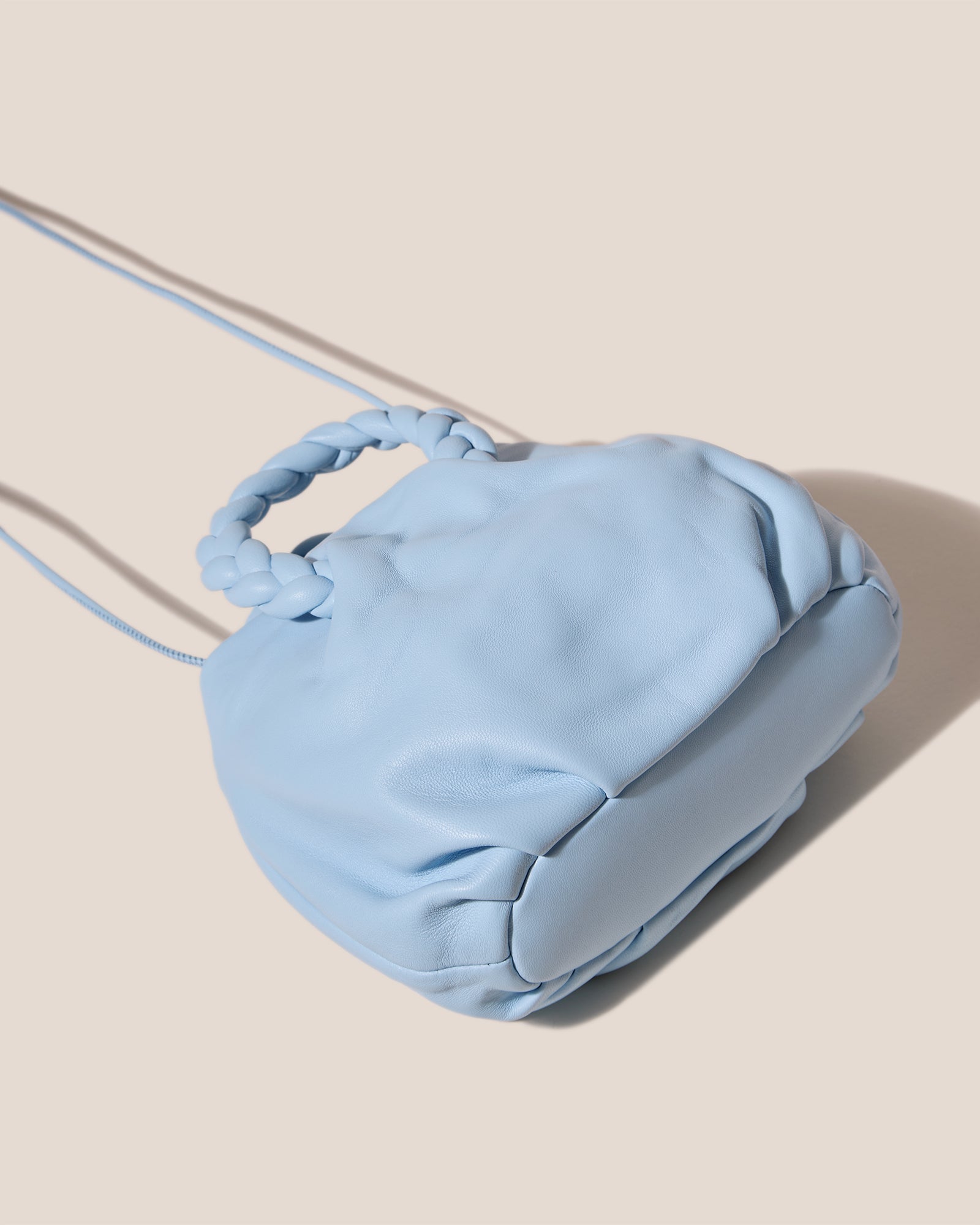 Small leather handbag with braided leather handles. With a slim adjustable strap, it can be carried as a crossbody or by hand. Crafted in supple lambskin lined with organic cotton canvas.