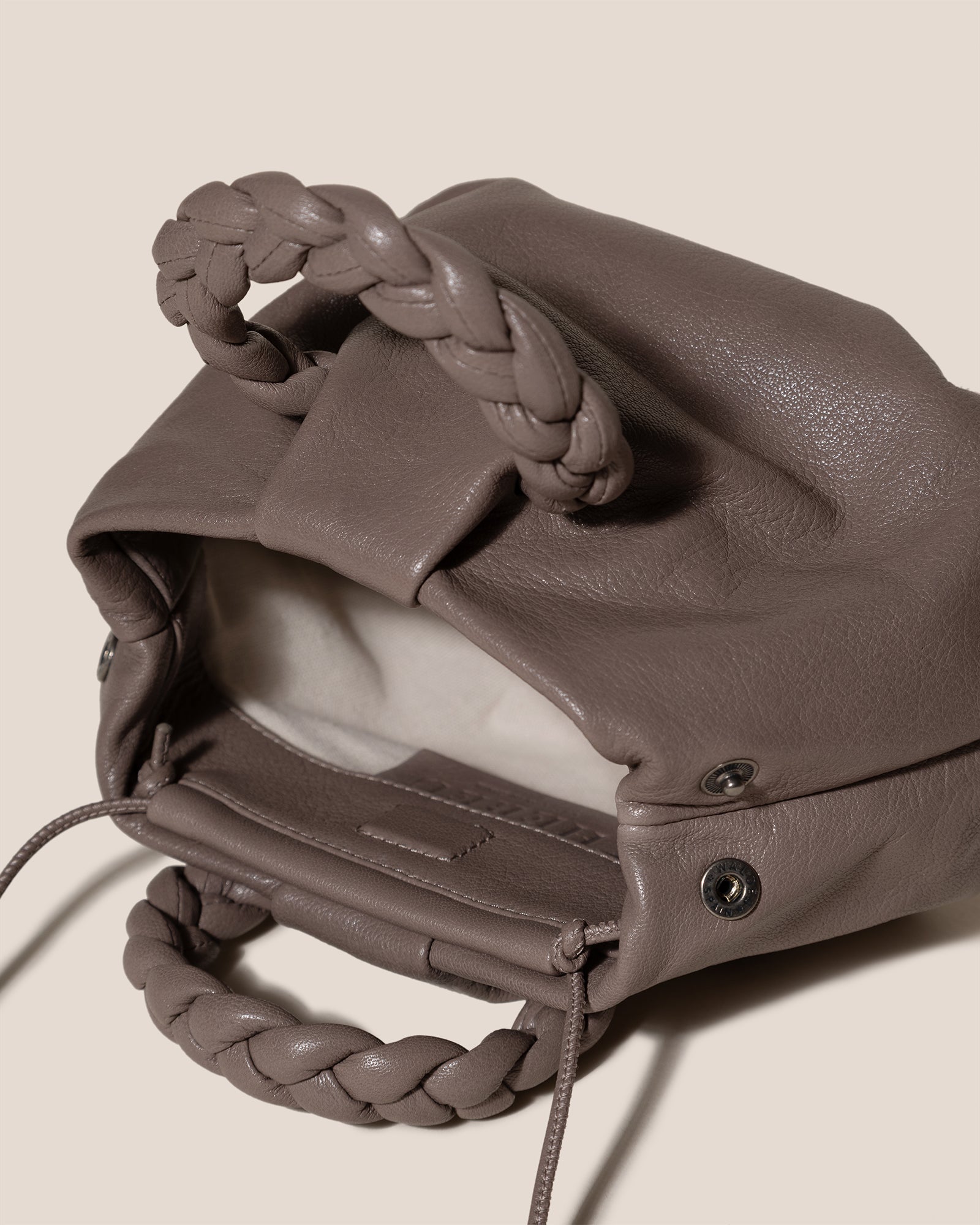 Small leather handbag with braided leather handles. With a slim adjustable strap, it can be carried as a crossbody or by hand. Crafted in supple shiny lambskin and lined with organic cotton canvas.
