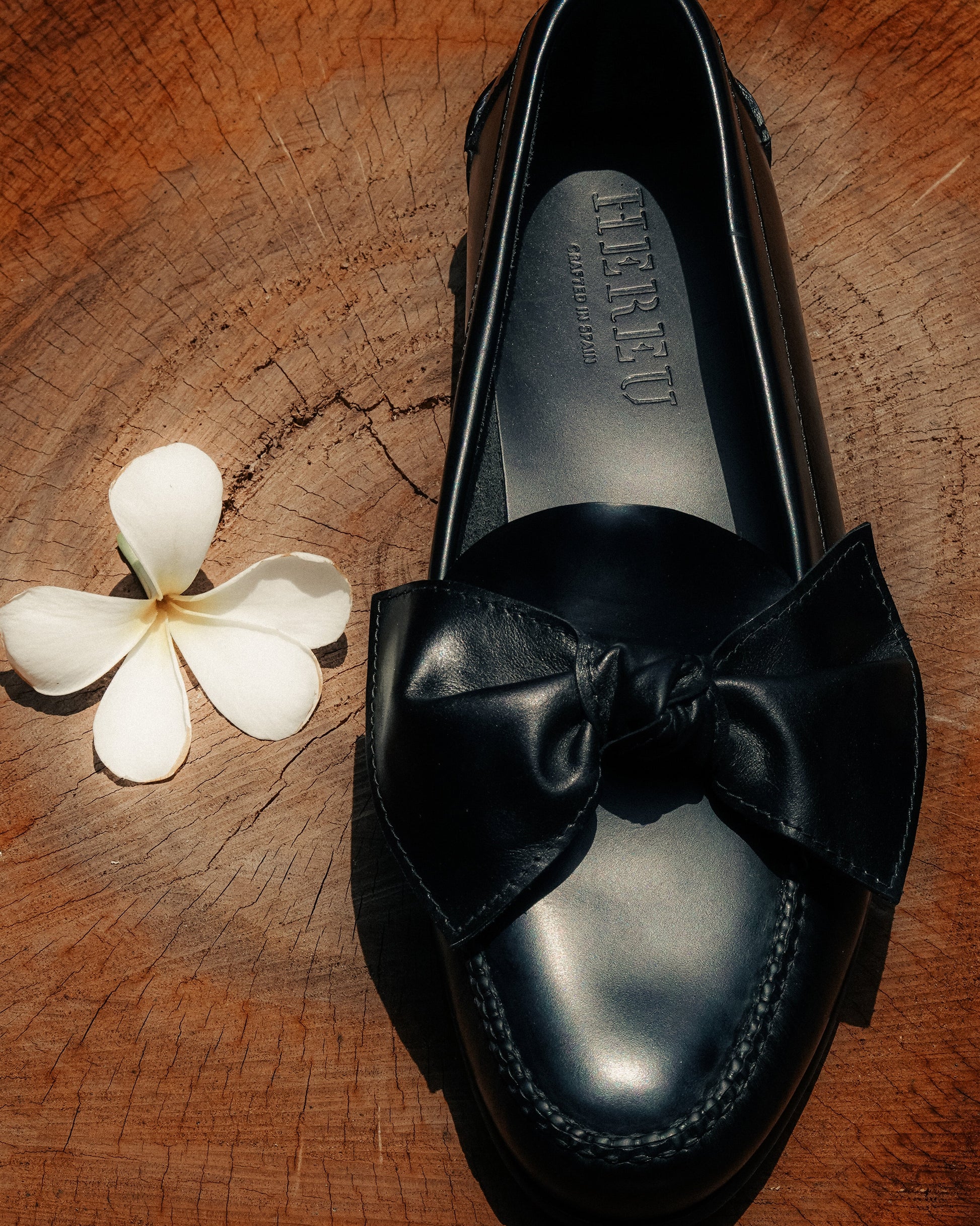 Slip-on loafer with front bow detail, crafted in shiny tumbled calf leather.