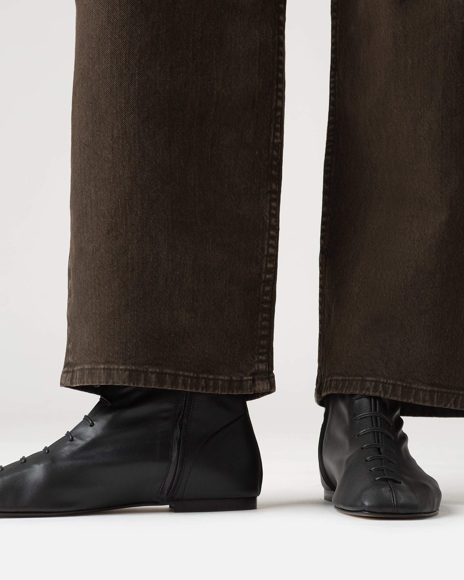 Deconstructed lace-up boot with bellows tongue (one piece), crafted in supple calf leather with matching leather laces.